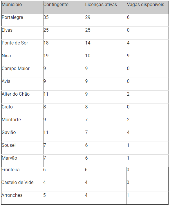 De acordo com as informações disponibilizadas, a nível nacional existem 13776 viaturas ao serviço, sendo que no distrito de Évora existem 163, no de Portalegre estão a circular 153 táxis e em Beja são 115 táxis.